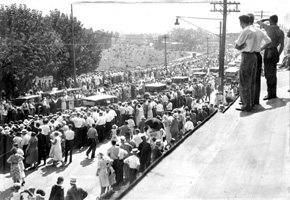 Crowds watch funeral procession for Micky Duffy in Yeadon, Pennsylvania. 1931
