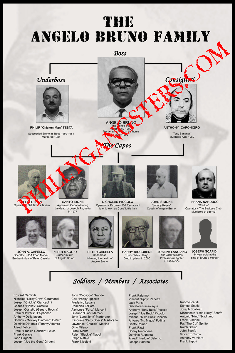 Angelo "The Gentle Don" Bruno (left) was the last of the old school Philadelphia Mafia Bosses. He was given the nickname "The Gentle Don" because he was like that, he thought everything over and didn't overreact, he handled his business in a quiet way that was good for the Philadelphia Family. Angelo Bruno was by far the most successful boss that the Philadelphia Crime Family ever had. Under his leadership the Family flourished, when he was killed the Family self-destruct.