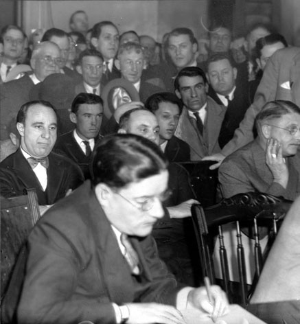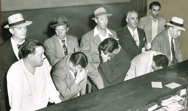 (upper left) Max "Boo Boo" Hoff (wearing bow tie) appears in Federal Court on counterfeit money charges. 1934