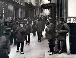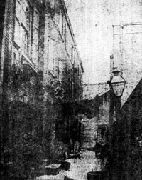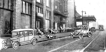 Reenactment of the attempted murder of Micky Duffy outside the Cadix Club. 1927