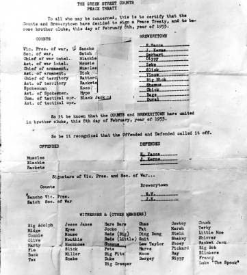 "The urban gang syndrome had just begun, led by the infamous Green Street Counts, and Bell repairmen would not go into some parts of the city after dark ...The vicious saga of the Green Street Counts hit headlines in the summer of 1953. Where the tragedy of the Head Hunters resulted from a more or less casual association, the Counts were a formalized, cold-blooded organization comparable to mobs of adult racketeers. The gang, with headquarters in the congested area of the city a few blocks north of city hall, had its rigid discipline of obedience to the mob will through fear (one boy was purposely shot in the leg after showing weakness in a robbery executed by the gang). It also boasted an arsenal of firearms. To these familiar attributes of criminal mobs, were added the juvenile touches of a written constitution, in which were designated such officers as "Secretary of War" and "Keeper of the War Chest". Last week- end another gang was discovered by the police in North Philadelphia with the same sort of constitution and by-laws.