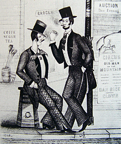 Meanwhile, all hell had broken loose. “We are told there are no less than five gangs of organized ruffians, either in the county, or on the outskirts of the city.” Seasoned columnist George Foster identified eleven “squads or clubs” in Southwark and Moyamensing populated by “loafers” who give themselves “outlandish titles.” The fiercer the better. Marauding the streets were Killers, Bouncers, Rats, Stingers, Nighthawks, Buffers, Skinners, Gumballs, Smashers, Whelps, Flayers “and other appropriate and verminous designations.” They marked their territories by fighting, rioting, and writing “in chalk or charcoal on every dead-wall, fence and stable-door.” They held their “nightly conclaves on the corners of by-streets or in unoccupied building-lots, sneaking about behind the rubbish-heaps, and perhaps now and then venturing out to assault an unprotected female or knock down a lonely passenger.”