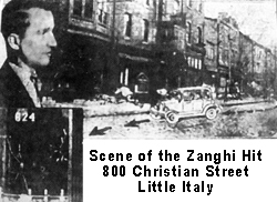 killing Joseph and Scabby. Sabella along with his gang, John Avena, Antonio Pillina, with John Scopoletti behind the wheel, drove off, after the mob hit. Musky Zanghi the actual target of the hit survived and became the mobs first rat. The newspapers headlines banner “The Underworld’s First Squealer”.